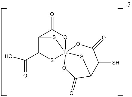 El estudio analítico indica que los complejos de 99mTc-DMSA no contienen Sn, como un complejo mixto de metal del tipo Tc-Sn-DMSA. El análisis estructural preliminar por RMN sugiere que la estructura química del complejo que se localiza en riñón está constituido por un dímero que consta de un átomo de 99mTc rodeado por dos moléculas de DMSA (61).