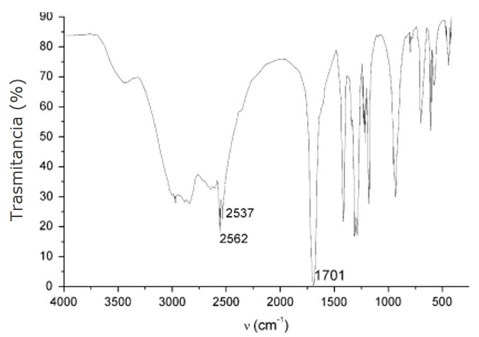 El espectro IR de DMSA (Figura 3) presenta dos picos débiles en 2562 cm-1 y 2537 cm-1, correspondientes a los grupos SH, y una banda fina e intensa en 1701 cm-1 que caracteriza el estiramiento de los grupos carbonilos (C=O), además de una banda ancha alrededor de los 3000 cm-1 que corresponde a las vibraciones O-H presentes en los grupos carboxilos (COOH) del DMSA (43, 45, 46).