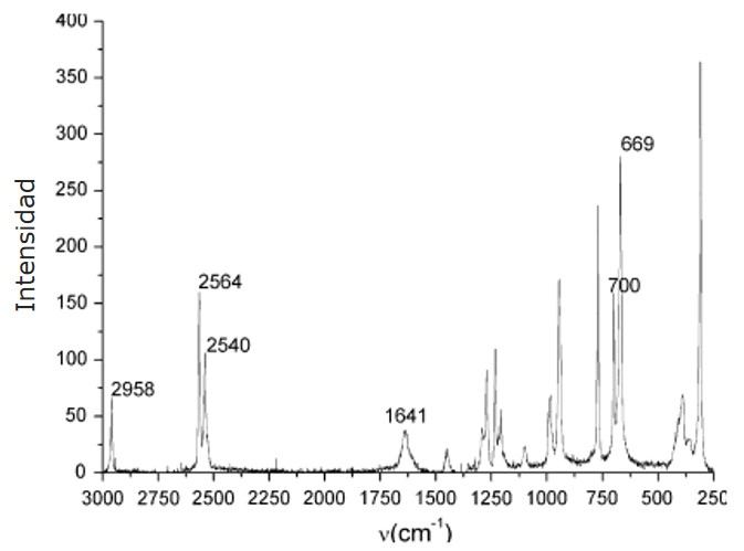 El espectro Raman (Figura 4) contiene más señales características que pueden ser identificadas. Las vibraciones C=O y O-H del DMSA se observan en 1641 cm-1 y 2958 cm-1 respectivamente. Las señales de C-S y S-H tienen dobles posiciones en 700/669 cm-1 y 2564/2540 cm-1, respectivamente (47).