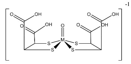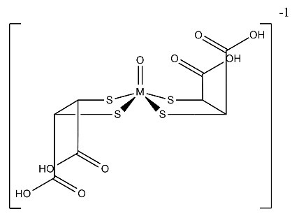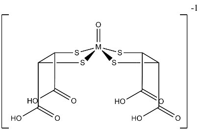 En sentido general el Tc(V) y Re(V) son ácidos duros, por eso su afinidad excelente por el átomo de O al formar los núcleos para los oxo-complejos, pero en el momento de formar los núcleos Tc=O y Re=O con carga 3+, la dureza disminuye considerablemente por pasar a ser una entidad biatómica más polarizable que un solo átomo de Tc con carga 3+. Esto explica la afinidad por la coordinación con los átomos de S del DMSA, que son bases blandas; mientras que la estructura propuesta por Moretti et al. (Figura 1) (28) para el complejo 99mTc(III)-DMSA, con núcleo Tc(III) (un ácido duro), justifica la coordinación con átomos O provenientes de los grupos carboxilos (base dura). Dicha diferencia explica la liberación de grupos tioles en detrimento de la coordinación de grupos carboxilos, lo cual justifica su biodistribución por la afinidad de los grupos tioles por las proteínas transportadoras de dicho radiofármaco, que lo conducen hacia la corteza renal (6, 29-35).