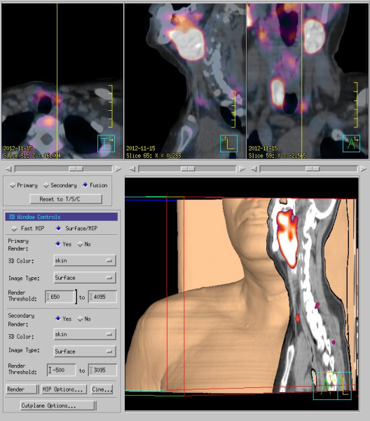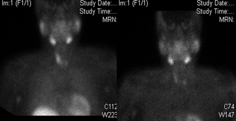 Las proyecciones de cabeza, cuello y tórax se realizaron a los 10 minutos y 2 horas después de la administración de 795 MBq de 99mTc-MIBI. La etapa inicial mostró captación del trazador limitada al lóbulo tiroideo derecho, el istmo y una región correspondiente al lecho tiroideo inferior izquierdo. En la fase tardía, se observó captación focal persistente en la región inferior del lecho tiroideo izquierdo (fig. 1).