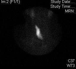 Se realizó SPECT / TC de la región y luego de analizar las reconstrucciones tomográficas se determinó que la captación focal izquierda correspondía a una lesión nodular de aproximadamente 4,6x5,5 mm. Los hallazgos fueron típicos de adenoma paratiroideo (fig. 2). Se realizó una gammagrafía tiroidea después de la administración de 200 MBq de 99mTc-pertecnetato. La imagen mostró una captación homogénea limitada al lóbulo derecho de la tiroides y el istmo. No se observó captación en el lecho tiroideo izquierdo, sugiriendo ausencia de tejido tiroideo funcionante en tal proyección. Al no existir historia de hemitiroidectomía previa, se interpretó como posible agenesia del lóbulo izquierdo (fig. 3). Se realizó una ecografía de cuello debido a la sospecha de agenesia del lóbulo tiroideo izquierdo y adenoma paratiroideo observado en las gammagrafías previas. El estudio mostró un lóbulo derecho de 13x15x39 mm, el istmo de 2,8 mm. El lóbulo izquierdo no se logró visualizar, confirmando el resultado de la gammagrafía. Se detectó además un nódulo sólido de 8,9x6,6 mm que impresionó como una paratiroides y no se observaron linfadenopatías cervicales.