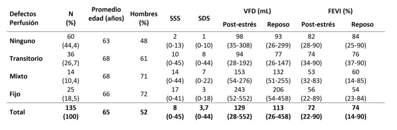 Selección de pacientes: De forma retrospectiva, se incluyeron pacientes adultos remitidos consecutivamente a nuestro centro durante 2016 para la evaluación de enfermedad coronaria bajo estrés farmacológico. Los casos se clasificaron según la presencia de defectos de perfusión, de acuerdo con lo descrito en el informe original. Se excluyeron los casos con bloqueo de rama izquierda y derecha, arritmias, marcapasos, estrés con dobutamina y anomalías del gatillado electrocardiográfico durante la adquisición, así como actividad extra-cardíaca que interfiriera en la interpretación. Analizamos finalmente 135 exámenes; el 52% de los pacientes eran varones y la edad media fue de 64.6 años.