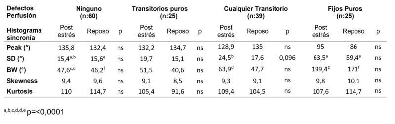 Procesamiento y análisis de imágenes: Se realizó control de calidad de las imágenes crudas en modo cine y mediante los sinogramas, con reconstrucción por método iterativo. La interpretación inicial incluyó el análisis visual y mediante software dedicado (QPS y QGS, Cedars Sinai, Los Angeles, CA, USA). El análisis de la sincronía mecánica del VI se realizó de forma retrospectiva utilizando software para análisis de fase (Synctool, Emory Cardiac Toolbox v. 4.1, Emory University, Atlanta, GA, USA) en forma ciega respecto a la interpretación inicial. Los parámetros del histograma del VI analizados fueron la desviación estándar (SD), el ancho de banda (BW), la asimetría (skewness) y la kurtosis. Para la perfusión se tabuló el puntaje de esfuerzo sumado (SSS) y el de diferencia sumado (SDS), así como la fracción de eyección del ventrículo izquierdo (FEVI) y el volumen final diastólico (VFD).