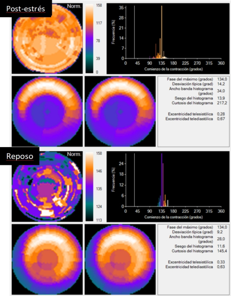 Los parámetros de fase más útiles en la evaluación de sincronía intraventricular son SD y BW del histograma; además, otros programas permiten medir la entropía del VI. La técnica se ha propuesto incluso para la evaluación de la cicatriz miocárdica y para evaluar la reserva de sincronía(4,21,22,23).