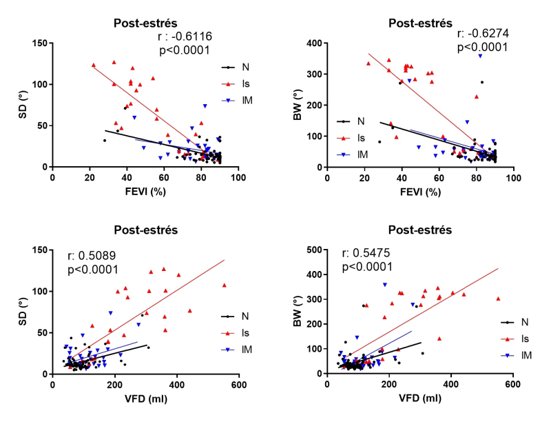 Hubo buena correlación entre la FEVI post-estrés farmacológico y la sincronía de contracción miocárdica utilizando DS y BW. Lo mismo se observó con el VFD en el post-estrés, ya que la sincronía disminuyó progresivamente al aumentar la dilatación ventricular (fig. 2). En todos los casos, el puntaje SDS calculado por Emory Cardiac Tool Box se correlacionó con SD y BW en el post-estrés, obteniendo valores positivos con p = 0,013 y p = 0,019 respectivamente.