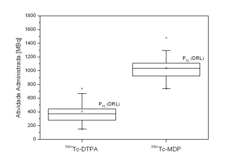 Análises estatísticas evidenciaram que as cintilografias óssea (99mTc-MDP), renal estática (99mTc-DMSA), renal dinâmica (99mTc-DTPA) e paratireóides (99mTc-MIBI) são realizadas em mais de 85% dos SMNs analisados, com respectivas atividades médias administradas de 1.036 MBq (28 mCi), 189 MBq (5 mCi), 406 MBq (11 mCi), 708 MBq (19 mCi) e valores de DRL respectivamente propostos de 1.110 MBq (30 mCi), 449 MBq (12 mCi), 185 MBq (5 mCi) e 740 MBq (20 mCi). A Figura 1 apresenta a dispersão das atividades médias utilizadas pelos SMNs para a realização da cintilografia renal dinâmica e óssea e a Tabela 2 apresenta a estatística geral das atividades administradas para os diferentes tipos de procedimentos diagnósticos, indicando as atividades mínima, máxima, média, desvio padrão e mediana das atividades usualmente administradas para indivíduos adultos, com correspondentes valores propostos para o DRL (percentil 75, P75). A comparação entre os valores propostos de DRL para pacientes adultos e os valores indicados em referências internacionais para alguns tipos de procedimentos é apresentada na tabela 3.