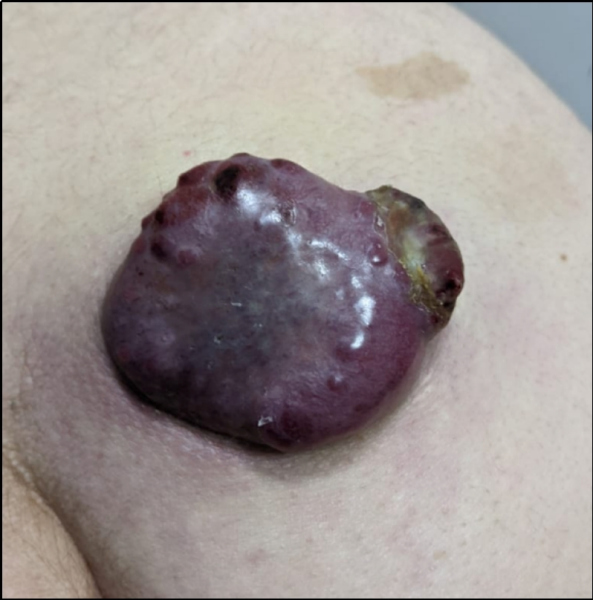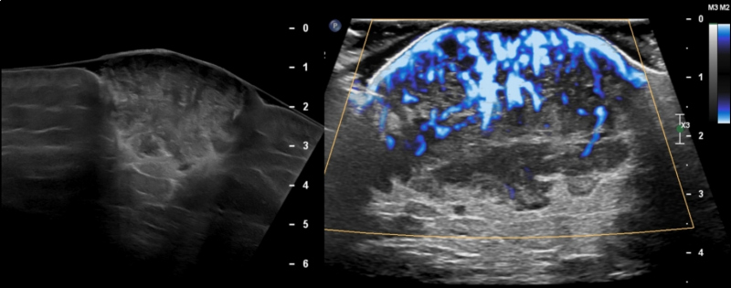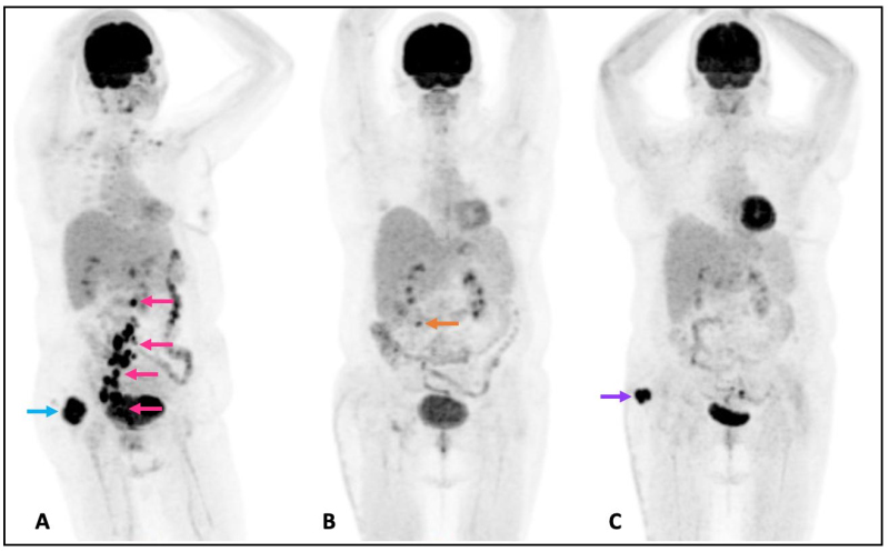 Mujer de 49 años con antecedente de leucemia de células pilosas (tricoleucemia) de riesgo bajo, en remisión completa. En septiembre 2020 presentó aumento de volumen en región supero-interna del glúteo derecho; ante la sospecha de una infección de tejidos blandos recibió antibióticos, sin mejoría. El mismo mes fue valorada en nuestra institución por la presencia de una neoformación cutánea dolorosa en glúteo derecho. Se realizó ecografía de la lesión dérmica (fig.1) y una tomografía de abdomen y pelvis en fase venosa, donde se observó una lesión sólida de 45 x 24 x 41 mm, con márgenes bien definidos y lobulados. Además se detectaron adenopatías ilíacas comunes, en cadena ilíaca interna derecha y en región inguinal homolateral, de entre 15 y 51 mm. Referida la paciente al servicio de Dermatología, la lesión fue descrita como una neoformación de aspecto nodular, cupuliforme, de 4 x 5 cm de diámetro, superficie lisa y violácea, sólida, a la dermatoscopía con patrón reticular y áreas rosas y blancas, sin estructura (fig. 2). Posteriormente se realizó biopsia por huso de la lesión glútea, con reporte de patología de carcinoma invasor de células de Merkel con invasión a dermis profunda (CK-, CK20+, Cromogranina +, Sinaptofisina -, Ki67 80%, CD56+, CD117+); además se tomó una biopsia excisional del conglomerado ganglionar inguinal, que confirmó la presencia de metástasis. Como parte de su estadiaje, en enero de 2021 se realizó un estudio PET/CT con 18F-FDG que documentó incremento focal del metabolismo en la lesión, así como adenopatías hipermetabólicas cervicales, retroperitoneales, ilíacas bilaterales e inguinales derechas. Debido a un sangrado no controlado del tumor, se procedió a la resección de la lesión glútea y colgajo de muslo posterior sin complicaciones, reportando márgenes quirúrgicos negativos. Al tratarse de una enfermedad metastásica, se administró quimioterapia a base de etopósido y cisplatino, en 5 ciclos desde marzo a junio y se realizó nuevo PET/CT con 18F-FDG para evaluar respuesta a tratamiento. Por presentar oligo-progresión ganglionar (adenopatía pericecal hipermetabólica), recibió radioterapia corporal estereotáctica (SBRT) 45Gy en 6 sesiones desde junio a julio de 2021. En agosto se realizó un nuevo PET/CT donde se observó desaparición de la adenopatía antes mencionada y una nueva lesión nodular de bordes lobulados en región glútea derecha de 36 x 32 mm con SUV máximo de 15,6. La fig. 4 muestra el MIP de los 3 estudios PET/CT: inicial, post-resección + quimioterapia y post-radioterapia. La paciente continuó su tratamiento experimentando respuesta completa aunque más tarde se comprobó recaída local y ganglionar, todo lo cual fue documentado mediante PET/CT, no incluído en esta publicación.
