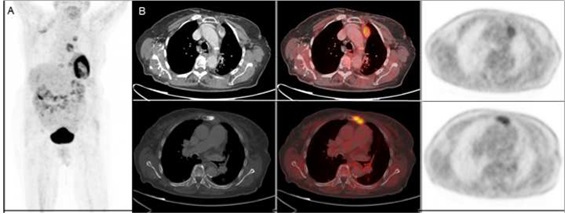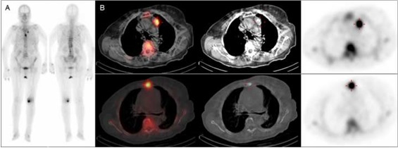 Mujer de 89 años diagnosticada de carcinoma mucinoso de mama izquierda estadio IIB (T2 N1 M0), tratado con cirugía más linfadenectomía axilar. Histológicamente, existía estroma mucoide en el tumor y sustitución masiva metastásica mucosecretora en ganglios axilares. Tras la radioterapia continúa seguimiento con remisión completa. A los seis años presenta elevación del antígeno carcinoembrionario (CEA), astenia y dolor en dorso. Es remitida al Servicio de Medicina Nuclear para descartar afectación ósea secundaria. La gammagrafía con 99mTc-HDP presenta un depósito en el esternón sugerente de malignidad y otro foco paraaórtico izquierdo, de difícil caracterización. El SPECT-TC de tórax localizó correctamente la captación sobre un nódulo mediastinal (fig. 1). Posteriormente, se realizó un PET-TC con 18F-FDG para re-estadificación, evidenciando compromiso metastásico óseo y ganglionar mediastinal (fig. 2).