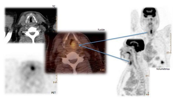 Existen radiofármacos como el 18F-Fluoromisonidazole que se acumulan selectivamente en el tejido hipóxico, con mínima captación en tejidos con oxigenación normal. Este trazador se ha empleado en diversos trabajos para la caracterización biológica de los tumores de cabeza y cuello, previo al tratamiento con radioterapia, proporcionando información pronóstica de respuesta al tratamiento(38). Esta caracterización permite una terapia molecular más específica, adicional a la radioterapia, en pacientes con hipoxia tumoral identificada en la PET- CT(38).