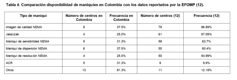 Cada uno de los parámetros evaluados por las pruebas de los protocolos de control de calidad requiere instrumentación especializada, la cual no está disponible en todas las instalaciones al no hacer parte de los procesos de venta del equipo. Las pruebas que se realizan en cada centro dependen de la instrumentación, tal como se muestra en las tablas 2 y 3. Esta dependencia también fue observada en países europeos; una encuesta realizada por Reynes mostró la falta de armonización en los procedimientos de control de calidad de PET en toda Europa(12). La tabla 4 muestra la comparación de número y porcentaje relativo de maniquíes disponibles en los centros colombianos encuestados y los centros PET-CT evaluados en Europa; puede verse que los porcentajes son aproximadamente un tercio de los resultados europeos.