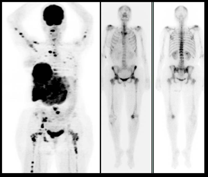 Figura 5. Paciente de 73 años, con cáncer de mama metastásico de 4 años de evolución. Las diferencias en la captación de FDG (izquierda) y MDP (imágenes de la derecha) son notables. Las zonas de hipercaptación de MDP son menores en número y extensión que lo visualizado por PET-CT. El hipermetabolismo en el esqueleto apendicular, de patrón heterogéneo, corresponde a concentración en médula ósea compatible con infiltración neoplásica, cambios poco visualizados por la gammagrafía.