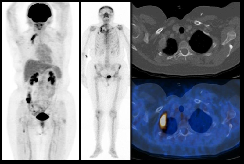 Figura 2. Paciente de 62 años con historia de cáncer de mama de 20 años de evolución. Derecha, PET-CT con FDG; centro, gammagrama óseo; derecha, cortes transvrsales del CT (arriba) y fusión PET-CT (abajo). Se observa una lesión lítica en el segundo arco costal derecho con intenso incremento en el metabolismo, que muestra además intenso incremento en la actividad osteoneogénica.
