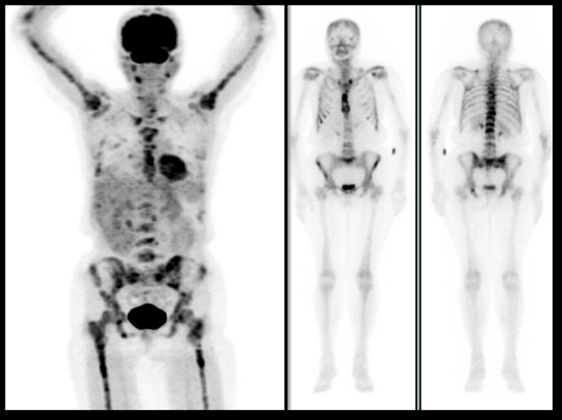 Figura 3. Paciente de 63 años con diagnóstico reciente de cáncer de mama, con patología articular inflamatoria de larga evolución. El gammagrama óseo (imágenes de la derecha) pone de manifiesto los cambios inflamatorios en grandes articulaciones, pero no hace evidentes lesiones en pelvis vistas en el PET (izquierda). En escápula izquierda se aprecia claramente una lesión que puede confundirse con etiología inflamatoria de hombro.