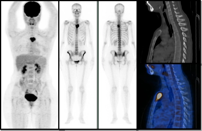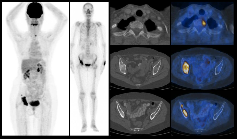 Figura 4. Paciente de 62 años cáncer de mama de 18 años de evolución, que presenta lesiones blásticas hipermetabólicas en articulación coxofemoral derecha, las que además expresan incremento intenso en la actividad osteoneogénica (imágenes de la izquierda, PET y gammagrama óseo respectivamente). Sin embargo, el estudio PET-CT con FDG también evidencia zonas focales de incremento metabólico en cuerpo vertebral de T2 e ilíaco derecho, (columna de la derecha) que no muestran cambios morfológicos y no son identificadas en el rastreo óseo con MDP.