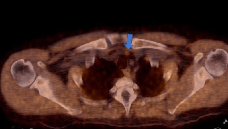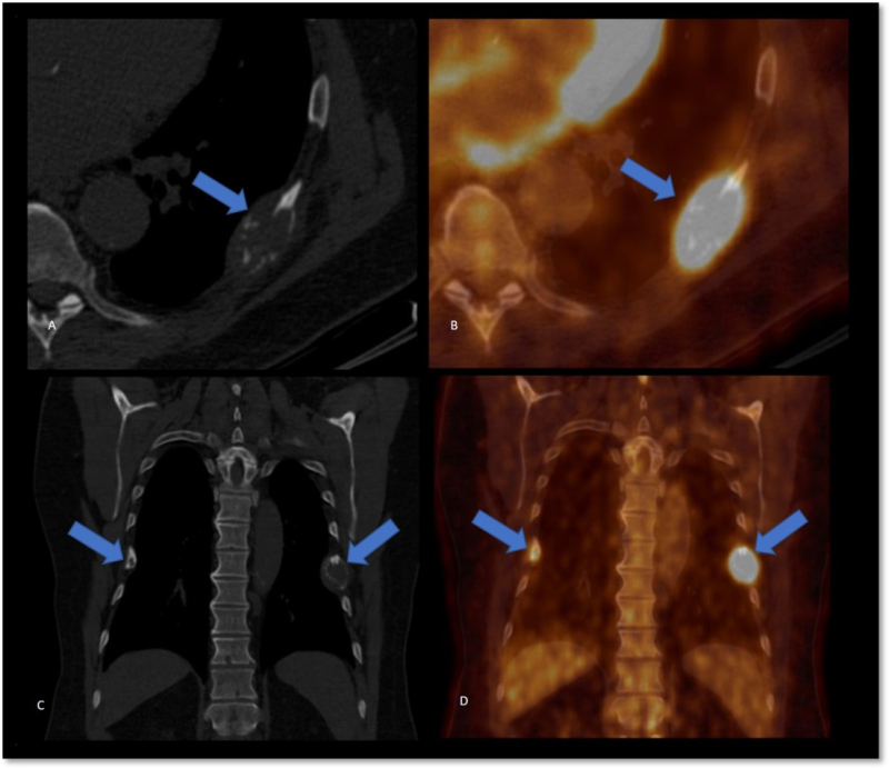 A raíz del hallazgo tomográfico y por sospecha de patología oncológica se solicita PET- CT con fluorodesoxiglucosa (18F-FDG), donde se advierten múltiples lesiones óseas líticas hipermetabólicas (algunas con erosión de la cortical), incluyendo un foco esternal con SUV máx. 8,4, otra en el 7° arco costal derecho (fig. 1) y una tercera imagen focal con insuflación cortical, densidad en vidrio esmerilado en su interior ubicada en tercio medio femoral (fig. 2, arriba), con algunos otros focos hipermetabólicos sin traducción tomográfica. También se evidencia a nivel submaxilar derecho una lesión con densidad de partes blandas, con captación aumentada (SUV máx. 4,2) y centro fotopénico en relación a necrosis.
