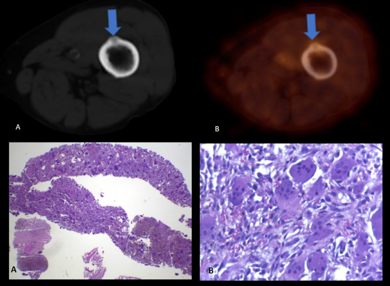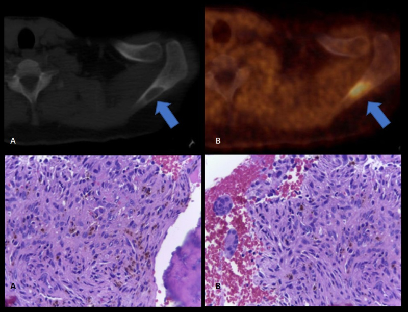La 18F-FDG es un radiotrazador que permite analizar el metabolismo energético de la lesión en estudio; representa un marcador imagenológico inespecífico, ya que puede ser captado con tanta avidez por una lesión oncológica como por una patología inflamatoria. Solamente indica aumento de metabolismo de glucosa y no informa sobre su etiología, la cual debe ser valorada en un contexto clínico-morfo-metabólico y certificada con estudio anatomopatológico. (3) En este caso, la interpretación clínica del PET-CT con FDG fue que la formación submaxilar estaba en relación a compromiso inflamatorio/infeccioso derivado del procedimiento quirúrgico odontológico reciente, descartando una posible patología oncológica linfo-proliferativa. Se llegó a la conclusión preliminar de que las lesiones óseas formaban parte de un proceso osteodistrófico debido a la patología renal crónica de base. Esto condujo a la toma de biopsia con confirmación histopatológica de la lesión en el 7° arco costal posterior izquierdo, donde se halló evidencia compatible con tumor pardo (fig. 2, abajo).