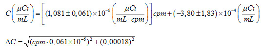 Para nuestro caso en particular, las ecuaciones a utilizar en el cálculo de la concentración C para un número dado de cuentas por minuto cpm y su incertidumbre asociada ΔC sería: