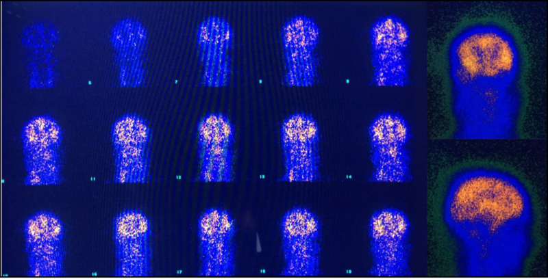 - A partir de 20 minutos da injeção, realizar imagens estáticas anterior, posterior e laterais, e SPECT (As imagens de SPECT são as ideais por proporcionar melhor visualização de todo o cérebro. Entretanto, ela pode não ser factível devido a todos os equipamentos ligados ao paciente. Caso não possa ser realizada, fazer imagens planas nas projeções anterior, posterior e pelo menos uma lateral para visualizar a fossa posterior).