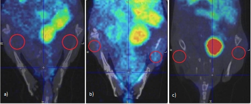 Previamente, para la adquisición de imágenes, los animales fueron anestesiados con isofluorano 2,5% en flujo de 1,5 mL/min de O2. La adquisición se realizó a un tiempo de 3 h post inyección, en un sistema de imagen preclínico para pequeños animales TriumphTM PET / SPECT / CT (Gamma Medica, Inc.) durante 60 min, ROR de 40 mm, colimador 5-pinhole, matriz de 80x80 píxeles.