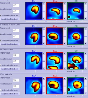 Se procesaron las imágenes con los programas Quantitative Gated SPECT (QGS®) y Quantitative Perfusion SPECT (QPS®) para segmentación automática, cuantificación y análisis de imágenes sumadas y gatilladas del eje corto o coronal resultantes del procesamiento convencional con reorientación y en posición anatómica sin reorientación, respectivamente. Se obtuvieron los mapas polares de ambos procesamientos y los parámetros de función ventricular y de perfusión.