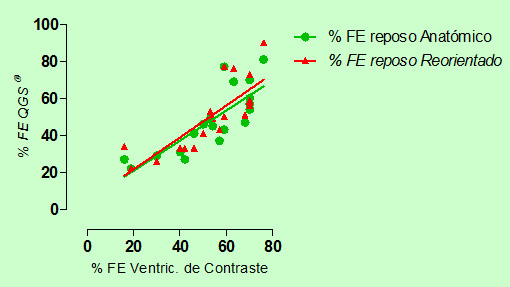 Fue destacable encontrar, además, correlación significativa entre la FEVI determinada con ventriculografía de contraste y con programa gatillado en reposo, con y sin reorientación de los ejes ventriculares.