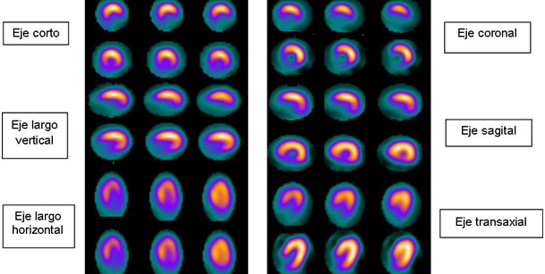 Las imágenes SPECT de perfusión miocárdica representan la técnica más utilizada actualmente para valorar la perfusión y la viabilidad celular en los pacientes con coronariopatía(1, 2). La reconstrucción de los datos tomográficos produce imágenes transaxiales, que se disponen de forma perpendicular al eje largo del paciente; posterior a esto, las imágenes son dispuestas de forma perpendicular al eje largo del ventrículo izquierdo (VI), conformando un eje corto del que luego derivan los ejes vertical y horizontal.