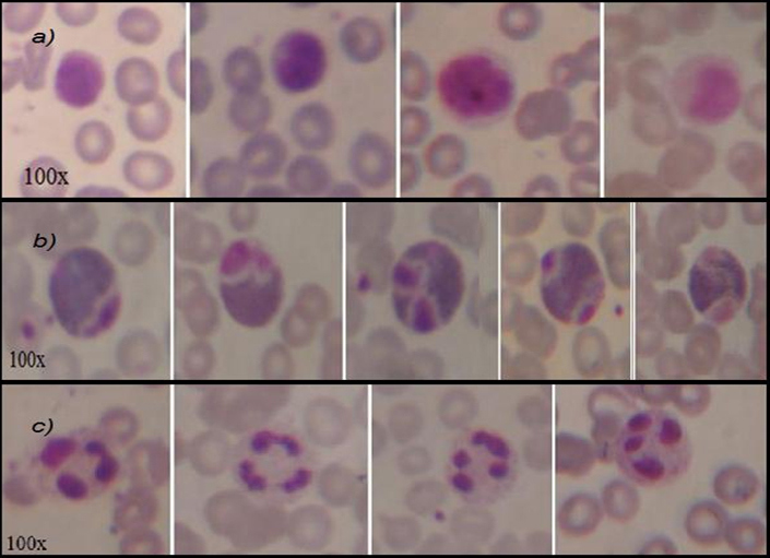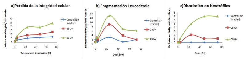 Los mecanismos de destrucción morfológica leucocitarios fueron estudiados considerando dos posibles factores causantes de estrés celular radioinducidos: el incremento en la concentración de potasio celular y la señalización molecular de lesión y muerte celular(19). En el análisis morfológico se observaron tres efectos biológicos radio-inducidos los cuales presentaron evolución, población blanco y dosis de aparición característica.