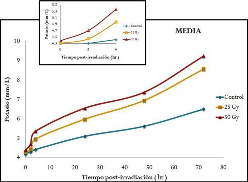 En otro sentido, se analizó la relación entre las concentraciones de potasio sérico y el tiempo post-almacenaje (fig. 3). Se encontró que en las muestras almacenadas a 4°C las concentraciones de potasio se incrementaron linealmente tanto en aquellas irradiadas a 25G y 50Gy como en el control sin irradiar. Sin embargo, a partir de las 24 horas post-irradiación las concentraciones de potasio crecieron en más de 1 mmol/L en el caso de los 25Gy hasta alcanzar una concentración promedio de 8,57mmol/L. En las muestras irradiadas a 50Gy se observó un incremento más acelerado en las concentraciones de potasio con respecto a la muestra irradiada a 25Gy y al control (tabla 2).