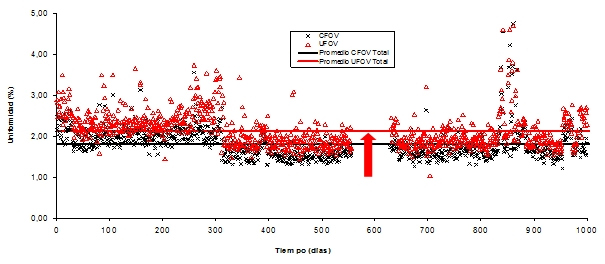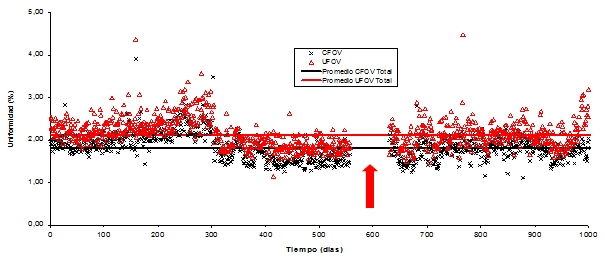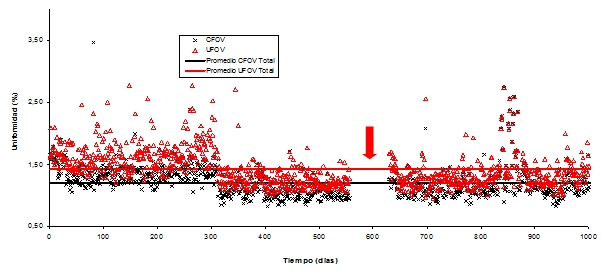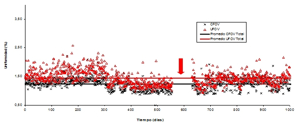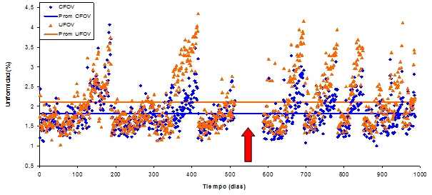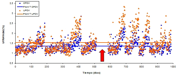 En las figuras 1, 2, 3 y 4, se muestran la variación de la uniformidad integral y diferencial para el detector 1 y 2 por un aproximado de 1000 días de medición (aproximadamente 5 años). Las flechas de color rojo señalan el periodo en que no se dispuso de material radiactivo debido a la escasez mundial del 99Mo. Las figuran muestran puntos que han superado nuestro límite superior de aceptación para ambos tipos de uniformidad. Por otro lado, debido a la intervención de la empresa que brinda el servicio de mantenimiento preventivo y correctivo, se han corregido situaciones donde los valores de uniformidad se han mostrado fuera del rango aceptable. En las gráficas es posible apreciar que en los primeros 300 días los valores de uniformidad son habitualmente mayores a nuestros estándares, lo que puede deberse a problemas que existían con el aire acondicionado de los recintos. Posteriormente a eso, se logró establecer un contrato de mantenimiento del sistema de aire acondicionado, lo que ha derivado en una estabilización del sistema.