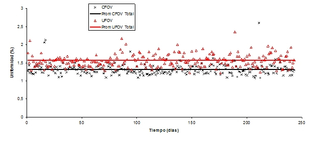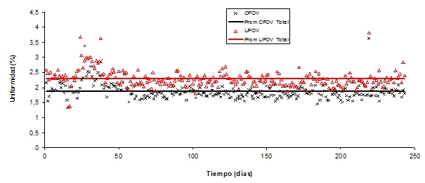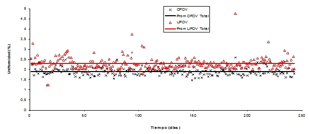 Los datos que se muestran en las tablas 3 y 4 son resultado del análisis de la uniformidad integral y diferencial de los dos detectores del equipo Siemens E.cam del HM. En las figuras 5, 6, 7 y 8 se presentan los resultados para el comportamiento del sistema por unos 250 días aproximadamente. Observando los resultados, se puede ver que se superan los límites establecidos y mencionados anteriormente; nótese que en especial se supera para los valores de la uniformidad integral, ya en el caso de la uniformidad diferencial se encuentran puntos que superan este límite por escaso porcentaje. Cabe mencionar que estas figuras no incluyen el período de escasez de 99Mo, ya que el físico médico se integró al servicio en setiembre de 2010, fecha posterior a dicho período.