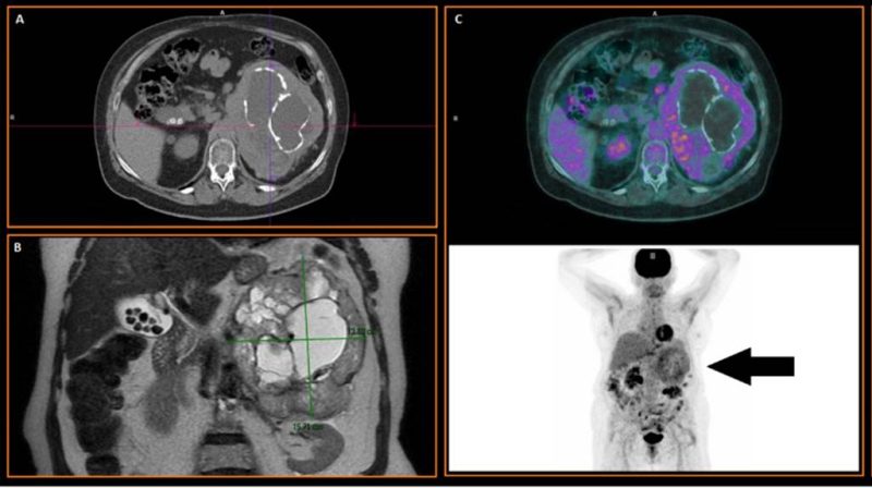 Mujer de 73 años con antecedentes de osteoporosis, portadora de hipertensión arterial (HTA) refractaria al tratamiento, en estudio por dolor abdominal, episodios de diarrea tipo secretora y pérdida de peso. A la exploración se destacaba sudoración profusa y masa palpable en hipocondrio izquierdo. En la tomografía axial computarizada (TAC) se descubre una tumoración adrenal izquierda de 15x3x16 cm, heterogénea y con calcificaciones, que desplaza estructuras adyacentes (fig.1A). En RMN presentó grandes áreas quísticas centrales (algunas hemorrágicas), componente sólido predominantemente periférico, restricción en difusión y bajos valores en mapa ADC, lo que sugería carcinoma suprarrenal o sarcoma retroperitoneal (fig.1B). Los niveles de catecolaminas/metanefrinas en orina se encontraron elevados.
