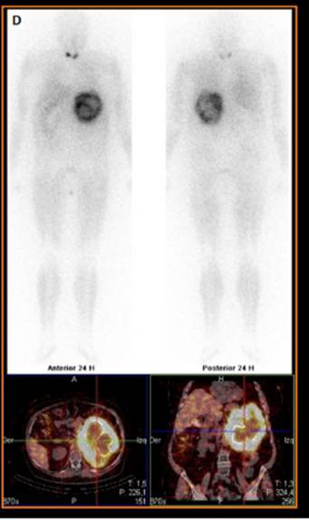 El estudio híbrido PET/CT con 18F-FDG mostró una gigantesca masa suprarrenal izquierda con incremento metabólico en su periferia (SUVmáx = 5,5) y ausencia de captación en los componentes quísticos centrales y áreas calcificadas. Dichos hallazgos eran compatibles con proceso neoformativo, cuyo grado metabólico no sugería carcinoma (fig.1C). Finalmente, la gammagrafía simpáticoadrenal con 370 MBq de 123I-MIBG y técnica híbrida SPECT/CT reveló intenso depósito focal del trazador a nivel de la glándula suprarrenal izquierda, correspondiente a un feocromocitoma con necrosis intratumoral asociada (fig. 2). Se inició bloqueo-alfa preoperatorio (fenoxibenzamina 5 mg) y se realizó suprarrenalectomía izquierda con nefrectomía ipsilateral en segundo tiempo. El estudio anatomopatológico confirmó feocromocitoma maligno con PASS-score (Pheochromocytoma of Adrenal gland Scaled-Score) de 7, potencial alto de malignidad. Actualmente la paciente se encuentra asintomática, habiendo cedido los episodios diarreicos y con normalización de cifras tensionales tras la cirugía.