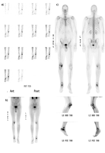 El estudio se completó con la realización de una gammagrafía ósea con 814 MBq de99mTc-hidroxi-difosfonato en 3 fases, mediante protocolo de adquisición de imágenes del pool vascular de los miembros inferiores distales en proyección anterior-posterior inicialmente, seguidas de imágenes planares precoces de miembros inferiores a los 10 minutos tras la inyección del radiotrazador en proyección anterior-posterior y por último, imágenes planares tardías de cuerpo completo y laterales de rodillas y pies a las 2 horas postinyección. Se evidenciaron signos de hiperemia e hipercaptación del radiotrazador en rodilla y retropié derecho, compatible con proceso inflamatorio [fase vascular Fig.a) y tisular Fig.b)], así como depósito difuso del trazador en rodilla, extremo distal de la tibia, astrágalo y calcáneo, compatibles con remodelación ósea activa en relación con Síndrome de Dolor Regional Complejo [fase ósea Fig.c)]. Al alta, fue derivado a Reumatología y actualmente se encuentra en tratamiento con prednisona 5mg/24horas, etoricoxib 90mg/24horas, gabapentina 300mg/8horas, ácido alendrónico 70 mg/semanalmente y terapia rehabilitadora-ocupacional, con evolución paulatinamente favorable.