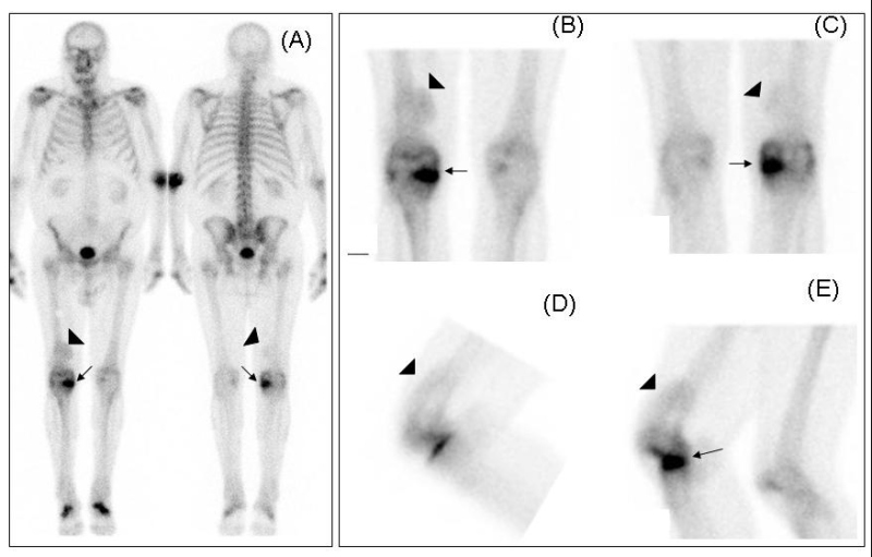 Figura 1 Rastreo óseo (A) e imágenes planares en proyección anteroposterior (B), posteroanterior (C) de ambas rodillas y proyección lateral externa (D) y lateral interna (E) de rodilla derecha. Foco de elevada actividad en compartimento interno de rodilla derecha (Flecha) en relación con gonartrosis y una captación en tercio distal del muslo derecho (cabeza de flecha), de leve actividad, distribución difusa del trazador en su interior y de crecimiento excrecente, no infiltrativa, que se extiende por fuera de los límites óseos en la cara anterior del fémur, englobando a éste.