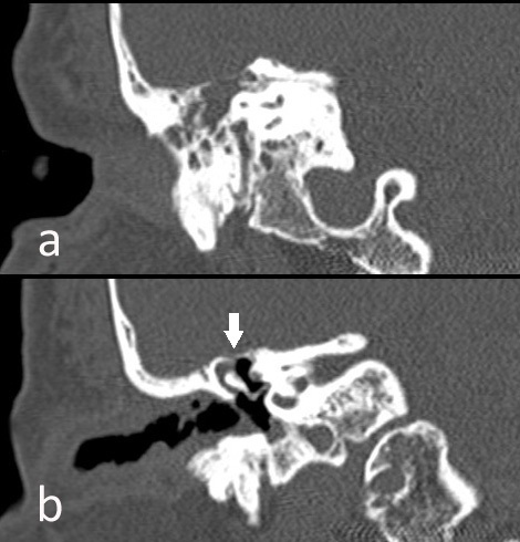 La fistula de líquido cefalorraquídeo (LCR) con otorrea persistente y pérdida de la audición puede simular la clínica de una otitis media común. La existencia de una fístula de LCR al oído medio debe descartarse ante un episodio de efusión unilateral, persistente y clara u otorrea secundaria a traumatismo craneoencefálico, mastoidectomía o afección crónica del oído. La cisternogammagrafía isotópica es una técnica útil y sencilla y para detectar la fístula de LCR, especialmente cuando existe sospecha clínica sin hallazgos patológicos con los métodos de imagen morfológica.
