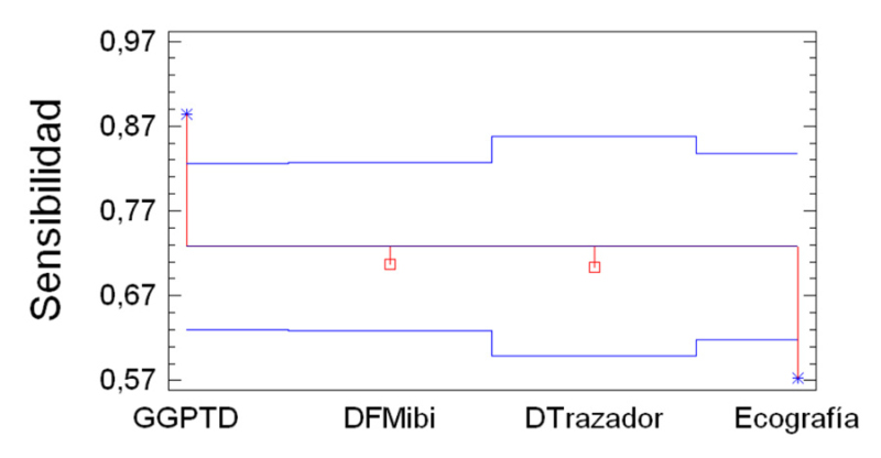 GGPTD: resultados de ambas técnicas combinadas DFMibi y DTrazador. (*) Diferencia significativa vs. ecografía.