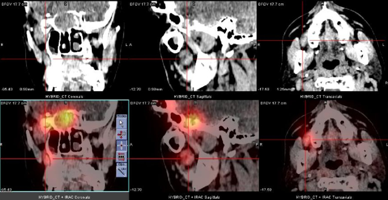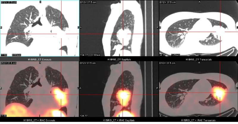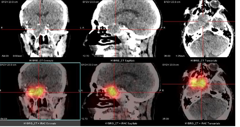 Uma quarta recorrência foi identificada por RM na região retro-orbital direita com progressão ipsilateral anterior para lobo temporal após cinco anos. Investigação pré-operatória constatou uma massa pulmonar na parte inferior do lobo superior esquerdo. Biópsia guiada por CT evidenciou meningioma atípico grau II. Um estudo com 111In-Oct SPECT/CT foi realizado como extensão diagnóstica. Foi evidenciada intensa fixação do 111In-Oct associada à presença de receptores de somatostatina a nível da lesão pulmonar (fig. 1), assim como na lesão temporal direita (fig. 2), confirmando recorrência. Tambén foi detectada fixação linfonodal direita (fig. 3).