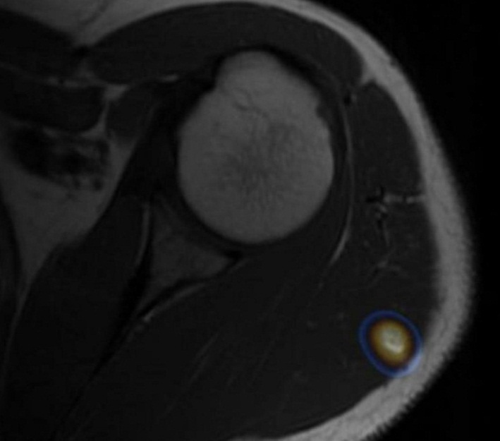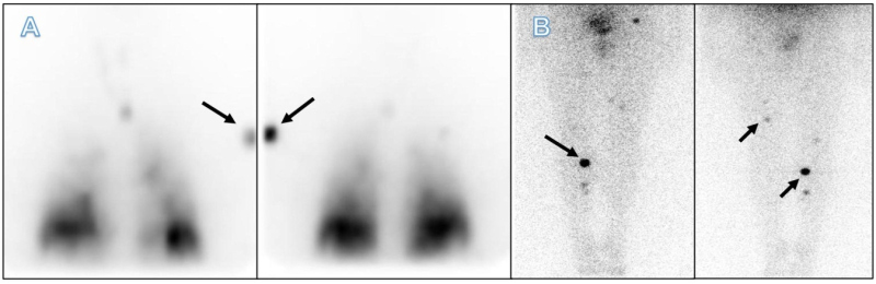 Es llevado a tiroidectomía total con vaciamiento ganglionar central y bilateral de cuello. El reporte anatomopatológico informa carcinoma papilar de tiroides de patrón clásico, multifocal, pT2(m), pN1b, cM1, Estadio II, con alto riesgo de recurrencia. Se indicó terapia con 7400 MBq (200 mCi) de I-131, con estudios bioquímicos que evidenciaron TSH 14,8 uUI/ml, tiroglobulina 500 ng/ml y anticuerpos antitiroglobulina negativos. Se realizó rastreo corporal total de control (Fig. 1), encontrándose dos restos tiroideos además de compromiso metastásico pulmonar y áreas yodocaptantes en húmero proximal y fémur izquierdo, coxofemoral ipsilateral y tibia derecha. Con el objetivo de realizar correlación anátomo-funcional se decidió solicitar resonancia magnética (RM) de hombro izquierdo, pelvis y miembros inferiores (Fig. 2). Se evidencia lesión intramuscular en la porción posterior del músculo deltoides izquierdo y lesión con captación de medio de contraste en músculo sóleo derecho, las cuales son concordantes con los hallazgos descritos en el rastreo corporal total y sugestivas de compromiso metastásico.