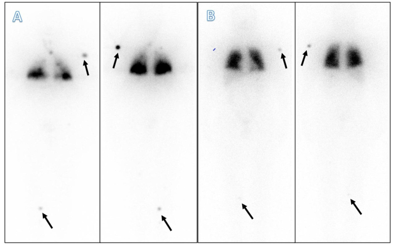 Se observó persistencia de captación en campos pulmonares, además de disminución de las lesiones yodocaptantes en región deltoidea izquierda y tibial proximal, con desaparición de la captación en fémur izquierdo (Figs. 4 y 5). Con este resultado, se realizó RM de control de hombro izquierdo y miembros inferiores, visualizándose disminución en el tamaño de las lesiones.