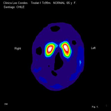 El NeuroSPECT del control normal demuestra una máxima concentración del Transportador de Dopamina en ambos núcleos caudados y en ambos putámenes, contrastando con la pobre captación relativa del radiofármaco en receptores no específicos de la corteza cerebral. Figura 1.