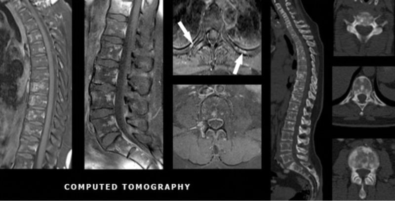 Nesta paciente, a cintilografia óssea mostrou leve aumento inespecífico de 99mTc-MDP em processos espinhosos de coluna lombar, articulações sacroilíacas, articulações do quadril e côndilos laterais do fêmur. Esse achado foi compatível com doença degenerativa osteoarticular. Biópsia de região pélvica e imunohistoquímica também foram realizadas e evidenciaram tecido hematopoiético reacional, excluindo neoplasia secundária.