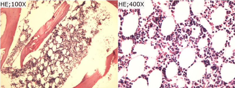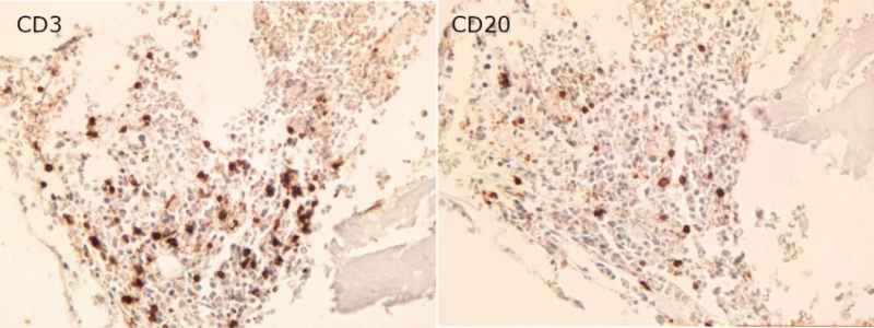 Tomografia computadorizada de tórax (fig. 2) e ressonância magnética (fig. 3), evidenciaram múltiplas formações nodulares ósseas aleatoriamente distribuídas em arcos costais e corpos vertebrais torácicos e lombares, sem sinais de fraturas patológicas. Biópsia (fig. 4) e estudo imunohistoquimico (fig. 5) foram realizados; a análise histológica revelou medula óssea com celularidade preservada e sem evidência de malignidade. A imunohistoquímica (IHQ) demonstrou expressão para CD3 e CD20 sem expressão de citoqueratina, sugerindo tecido hematopoiético reacional e excluindo neoplasia secundária.