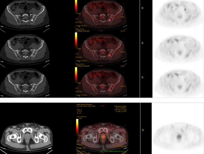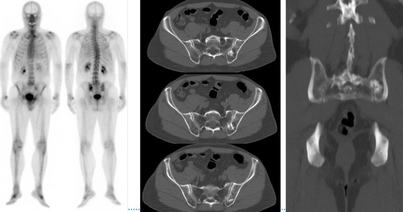 Hombre de 69 años, atleta, con diagnóstico reciente de adenocarcinoma de próstata, Gleason 3+3, PSA 4,2 ng/ml, al que se realiza centellografía ósea para estadificación (fig.1). Se observó la presencia de imagen hipercaptante única en tercio medio de la unión sacroilíaca izquierda. Este foco se correspondió con imagen lítico-blástica por CT en la porción posterior del ilíaco izquierdo, adyacente a la articulación sacroilíaca. Posteriormente se realiza estudio PET/CT F18-colina para descartar o confirmar carácter maligno de la lesión en base a su afinidad por el radiofármaco. Se comprobó captación leve de F18-colina en la lesión, consistente con proceso inflamatorio no tumoral (fig. 2). Se interpretó como geoda acompañada de reacción inflamatoria local. El tumor primario de próstata, a su vez, presentó captación intensa del trazador.