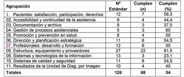 - Bloque III. Profesionales: 5 estándares del Grupo I, de los cuales 2 son obligatorios (de ellos cumplimos ambos) y 3 no obligatorios. Se consigue el 50%.