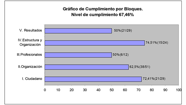 - Bloque V. Resultados: 5 estándares del Grupo I, de los cuales 4 son obligatorios y de ellos cumplimos 4 y cero no obligatorios. Se consigue el 50%.