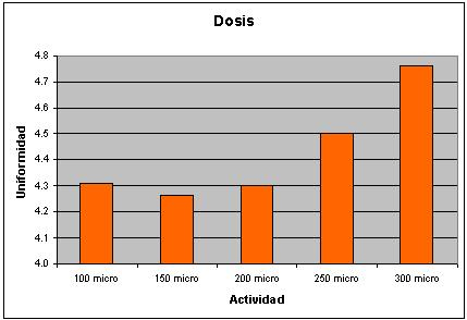 Un tercer experimento en condiciones standard pero variando la actividad de la fuente entre 100 - 300 µCi y calculando el promedio de todos los detectores nos indica que el mejor rendimiento no se halla en los valores extremos y mucho menos en actividades elevadas.