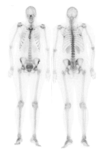 Figura 1. Centellograma óseo de cuerpo entero con 99mTc-metilen-difosfonato (MDP), vista anterior (izquierda) y posterior (derecha). Se observa extensa y marcada captación anormal del 99mTc-MDP en grupos musculares de tronco y proximales de los 4 miembros. Además, existe hipercaptación renal bilateral que supera la intensidad habitual en la gamagrafía ósea.