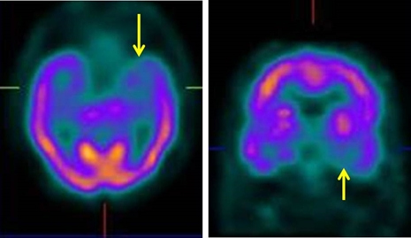 Figura 2. SPECT de perfusión cerebral (a la izquierda, corte transversal paralelo al eje mayor del lóbulo temporal; a la derecha, corte coronal a la altura del cuerno temporal), mostrando la hipoperfusión temporal izquierda (flechas), patrón compatible con el dato clínico de APP.