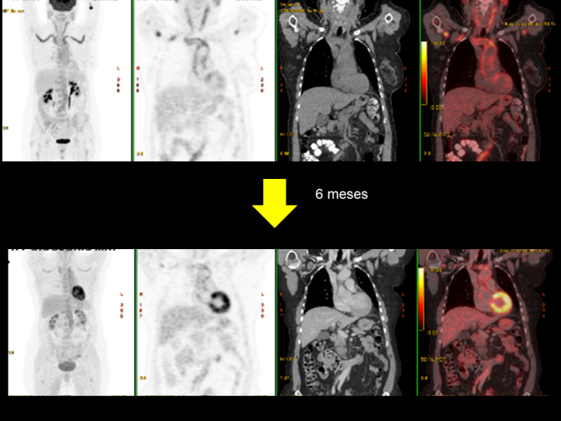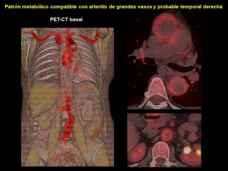 Si bien la biopsia de arteria temporal es normal, en el PET-CT existe importante afectación de la aorta desde la porción ascendente hasta la bifurcación y grandes ramas, compatible con una arteritis inflamatoria. Se decide iniciar terapia esteroidea y mantener estrecho seguimiento en consultas externas, con el diagnóstico de probable arteritis granulomatosa.